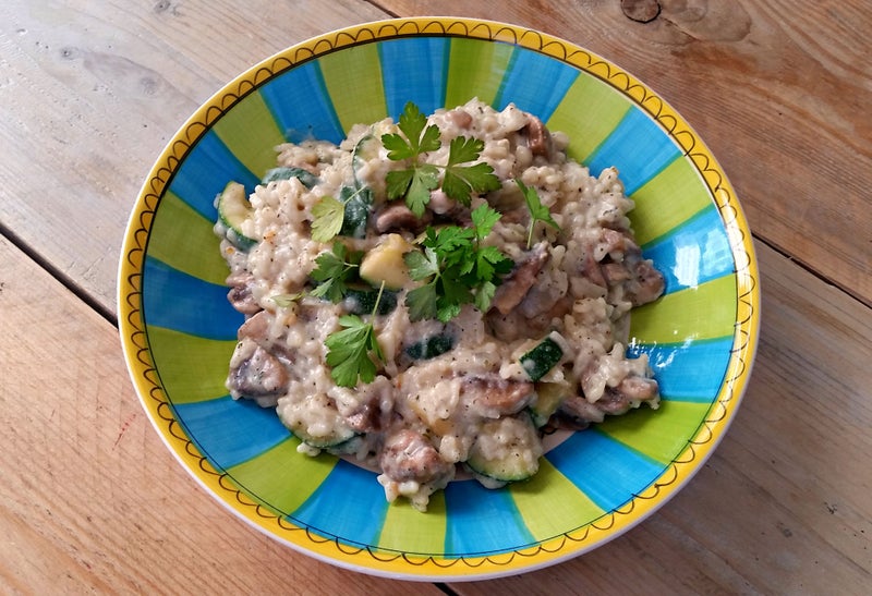 Gebruik een grote hapjespan of een braadpan voor de risotto. Eerst gaan we hierin de groenten bakken. Snijd de champignons in vieren en de courgette in stukjes. Bak de groenten ongeveer 8 minuten op middelhoog vuur samen met 1 theelepel Provençaalse kruiden en wat peper en zout. Leg de groenten hierna even aan de kant op een diep bord.