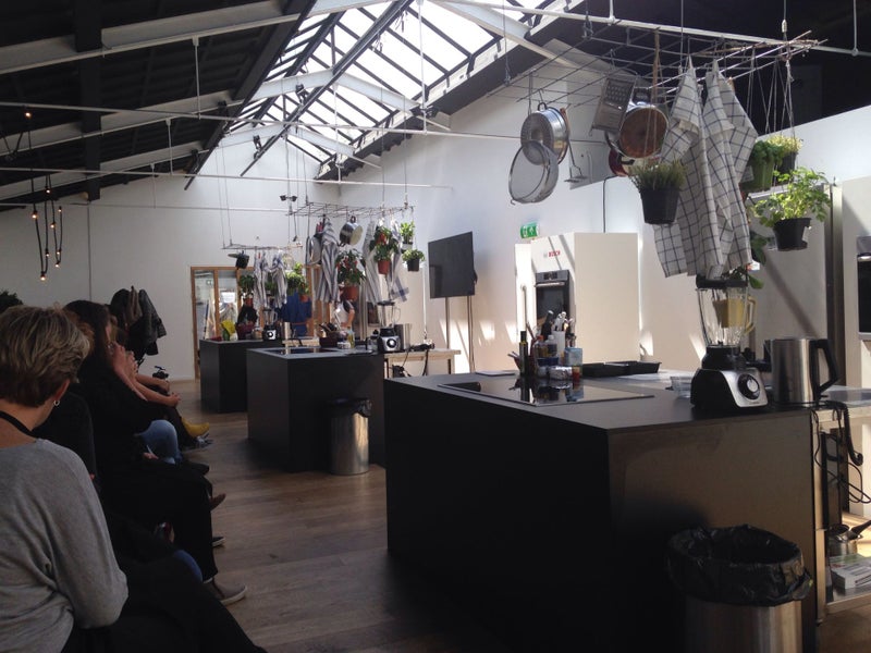 De workshop vond plaats in de LINDA. kookstudio. Deze studio werd mede mogelijk gemaakt door Bosch. Er stonden dus een aantal super-de-luxe Bosch keukens in de studio. Het was allemaal heel gezellig aangekleed. De bakvormen en andere benodigdheden waren allemaal al netjes neergelegd. Bij binnenkomst mochten we meteen een schort pakken. Dit schort was voor onszelf en mochten we mee naar huis nemen. Super leuk! Menno liep al rond in de studio en schudde ons vrolijk de hand. Hij is nog veel langer in het echt dan op de tv! ;-)