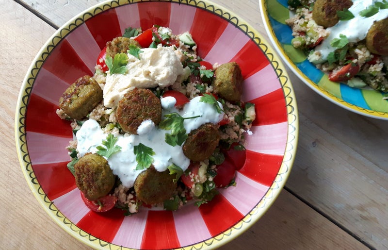 Deze kruidige couscoussalade vind ik ook altijd fijn na een lange dag. Je hoeft alleen de kant-en-klare falafel te bakken en verder bereid je alles in een saladeschaal. Klik hier voor het recept.